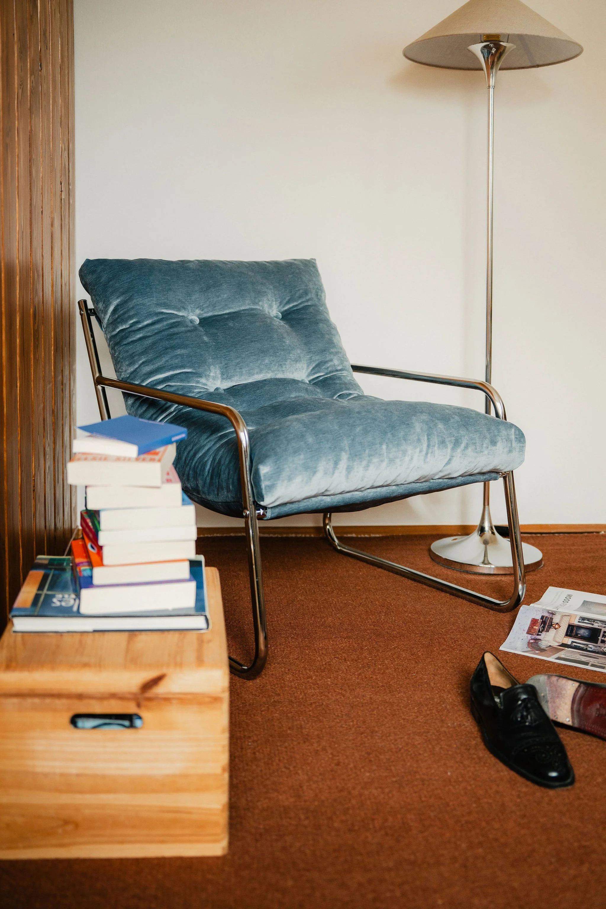 STÜHLE 6_Stuhl Blau Details 7_Stuhl Braun Details 8_Klappstuhl Natur Details 54_Sessel Eisblau Metall Details